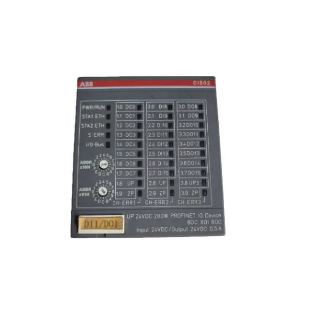 - ABB Type Designation: CI502-PNIO - Module ID: 7005 (WORD) - Catalog Description: PROFINET® IO RT Bus Module with 8 DI, 8 DO, 8 Configurable I/O - Product Type: PROFINET IO Interface & Digital I/O Module - Manufacturer: ABB Automation Products GmbH |